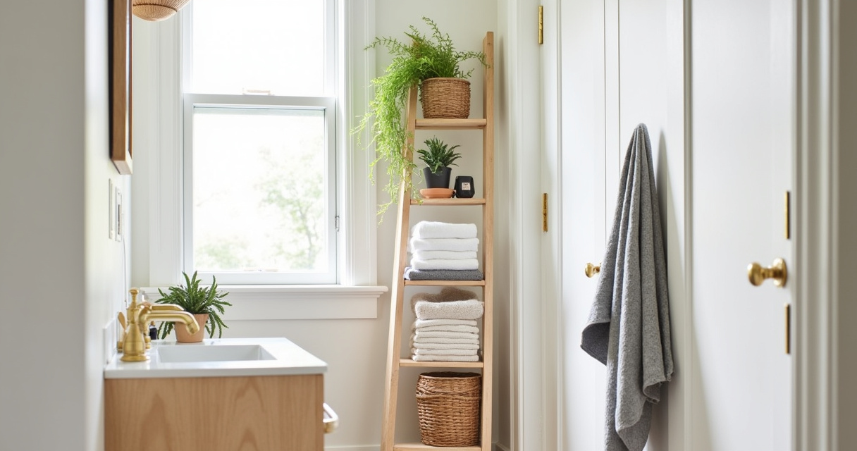 How should you actually style a ladder shelf in a bathroom to make it both functional and visually appealing? The trick is to create a balanced mix of decorative and functional items. Incorporate plants, scented candles, small pieces of artwork, alongside practical storage like neatly folded towels or toiletries organized in attractive baskets. Vary the heights and textures of the items you display to create visual interest and avoid a cluttered look.