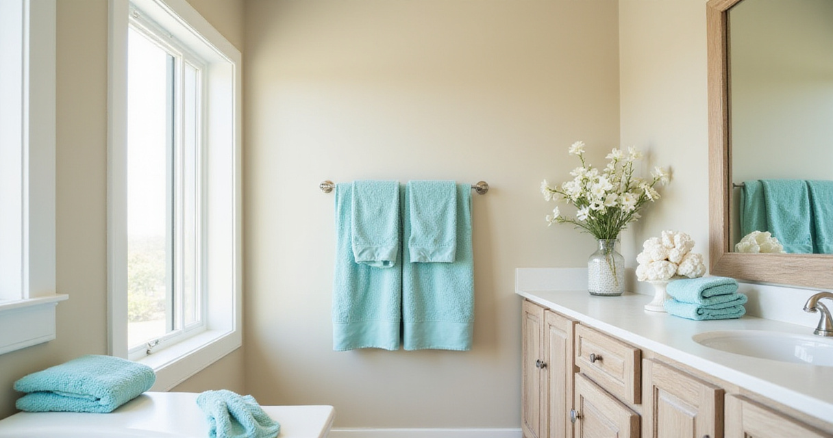 Textured towels enhance beach bathroom ideas by adding both visual interest and practical benefits. Waffle weave and similar textured styles create depth and dimension that flat terrycloth lacks, contributing to a more layered and sophisticated design. Beyond aesthetics, these textures promote better airflow between fibers, accelerating drying time—a particularly valuable quality in humid bathroom environments. Their typically lighter weight feels appropriate for warmer climates and coastal settings, reinforcing the breezy, effortless vibe central to beach-inspired design.