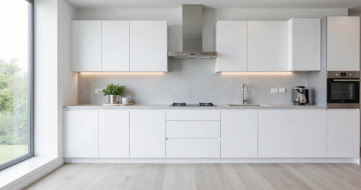 Materials emphasize clean surfaces and understated elegance: wood veneer in light or muted tones; durable laminate in matte or high-gloss finishes; smooth melamine; luxurious acrylic; industrial metals; and selective use of glass. This design approach enhances the overall kitchen space by creating a sense of openness, promoting a calming atmosphere, providing a neutral backdrop for other design elements, improving functionality, and offering timeless appeal that transcends trends.