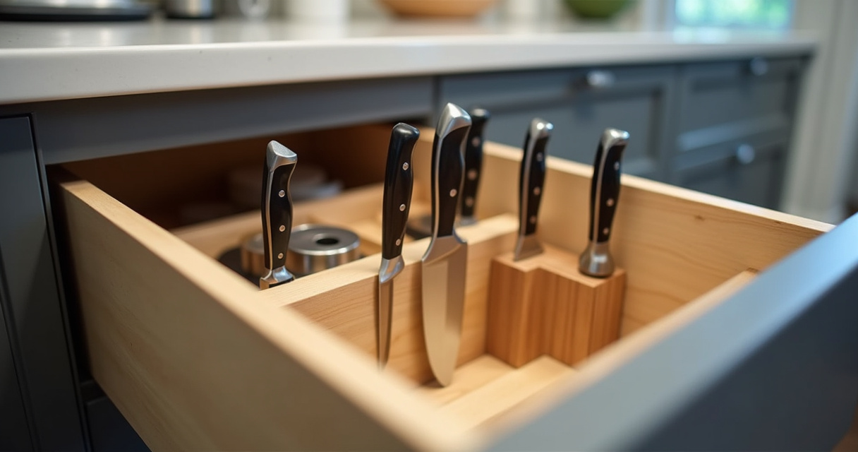 The breakthrough came when kitchen designers realized that horizontal knife storage could be both safer and more space-efficient than traditional countertop blocks. To implement this solution, measure your drawer height first to ensure the knife block will fit comfortably. Then place it inside, making sure it has non-slip feet or securing it with adhesive strips to prevent movement. Insert knives into the designated slots with blades down for safety.